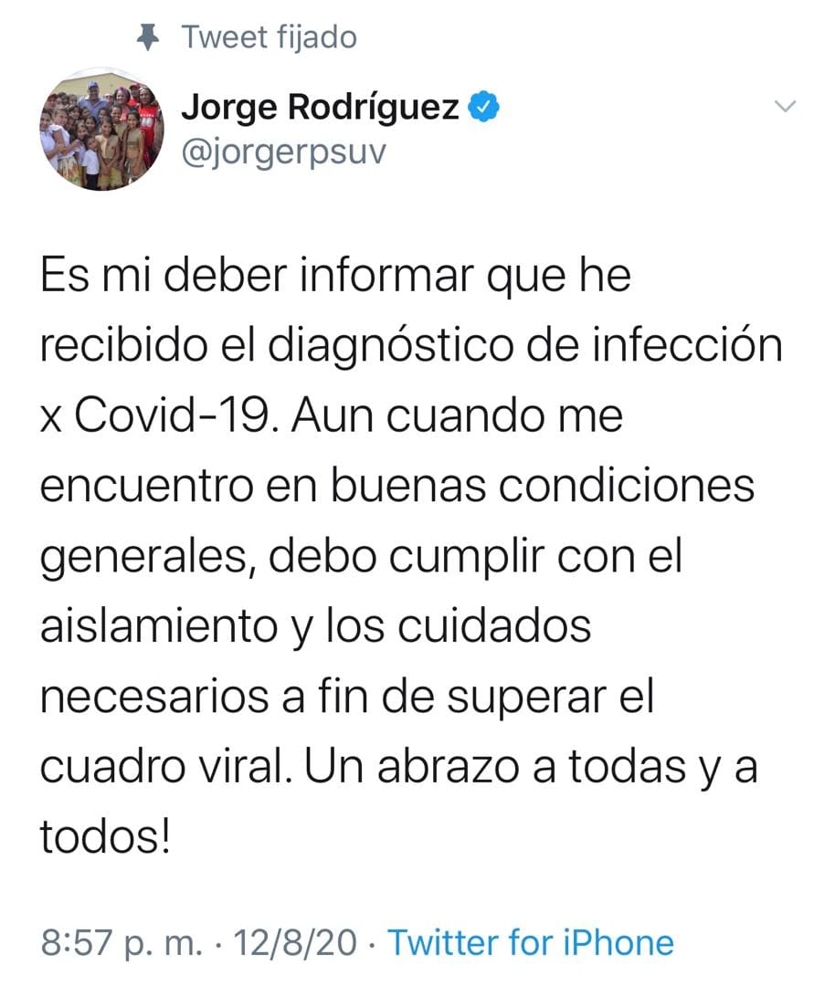 Más temprano el ministro de Comunicación venezolano, Jorge Rodríguez, quien habitualmente ofrece el balance de contagios en el país, dio a conocer en su cuenta twitter, que su prueba resultó positiva y que está contagiado de Coronavirus.