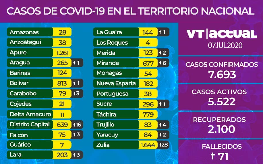 La cifra de contagiados por el Coronavirus en Venezuela se incrementó a 7.693 personas. De acuerdo con cifras oficiales, en las últimas 24 horas se registraran 282 nuevos casos, precisó el ministro de Comunicación e Información, Jorge Rodríguez.