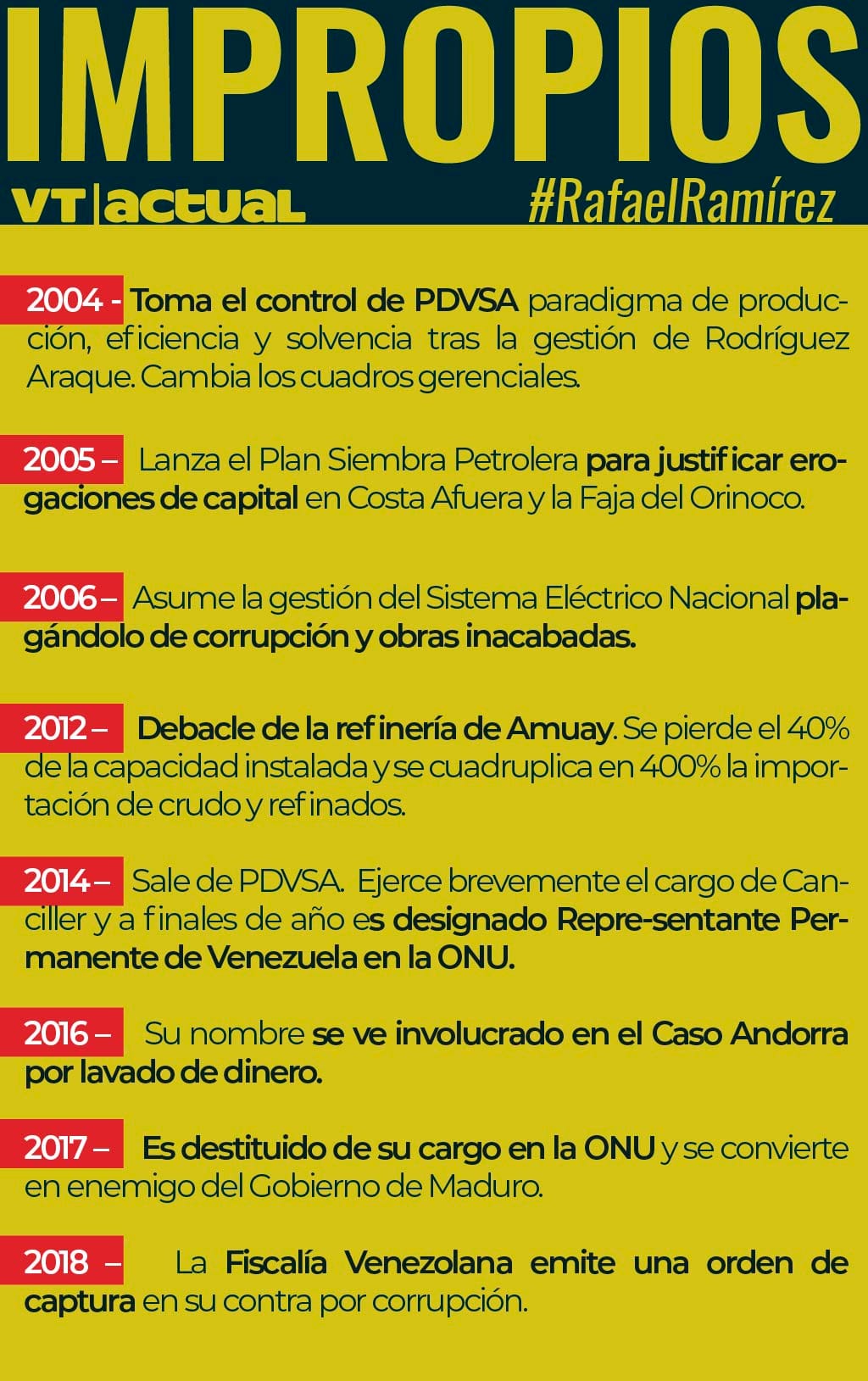 Para aquel entonces, pocos imaginaban que aquel personaje que se deshacía en arrebatos de amor por la Revolución Bolivariana destruiría – a través de un elaborado entramado de corrupción – la industria petrolera nacional y el sistema eléctrico venezolano, traicionando así a la Patria de Bolívar y al legado de Hugo Chávez plasmado en el Plan de la Patria.