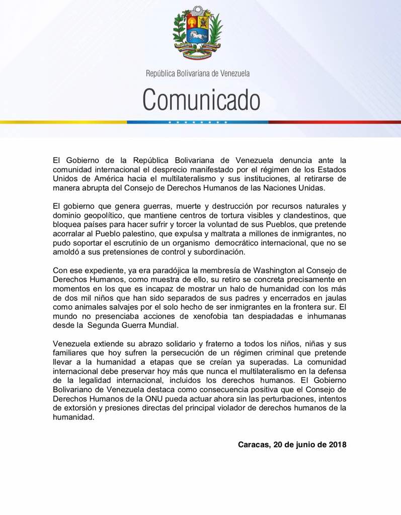“El Gobierno Bolivariano de Venezuela destaca como consecuencia positiva que el Consejo de Derechos Humanos de la ONU pueda actuar ahora sin las perturbaciones, intentos de extorsión y presiones directas del principal violador de derechos humanos de la humanidad”.