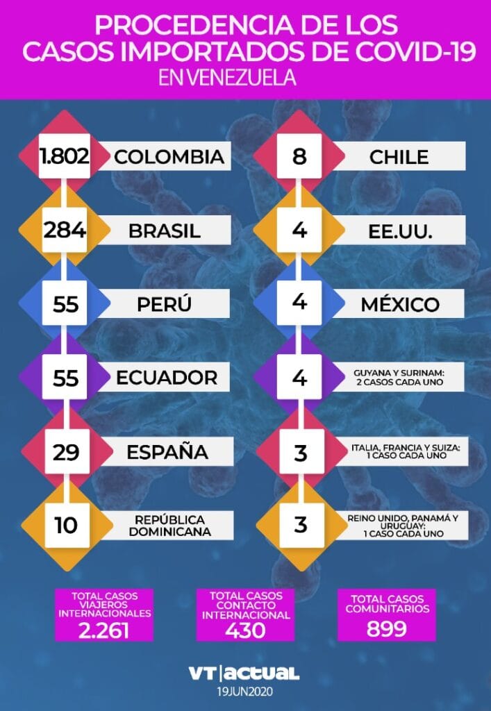 El gobierno de Venezuela reportó este viernes que los casos de contagio por Covid-19 se elevaron a 3.59o luego de que en las últimas 24 horas de detectaran 106 nuevos casos de los cuales 19 son casos de transmisión comunitaria y 87 son casos importados.