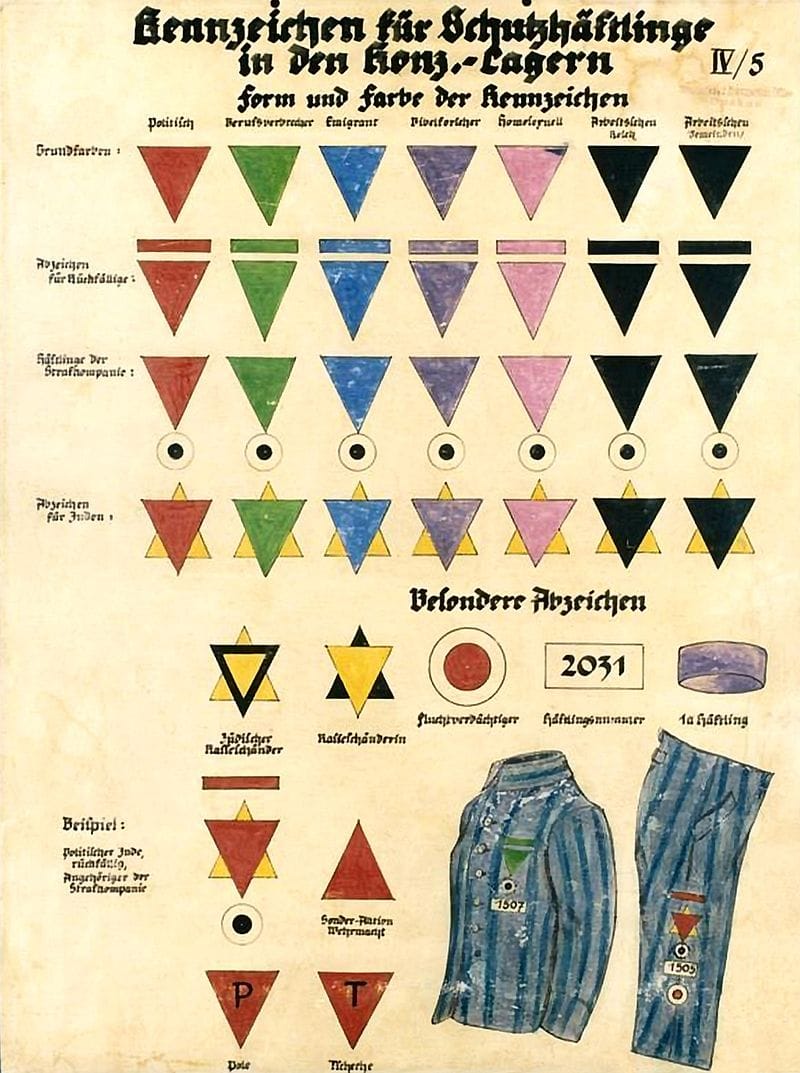 El amarillo era para los judíos, el rojo para los prisioneros por razones políticas, el verde para los criminales comunes, el azul para emigrantes, púrpura para los Testigos de Jehová y evangélicos, rosa para los homosexuales hombres y el negro para lo que ellos llamaban como «ajeno a la comunidad» o «vago, que no le gusta o no puede trabajar».